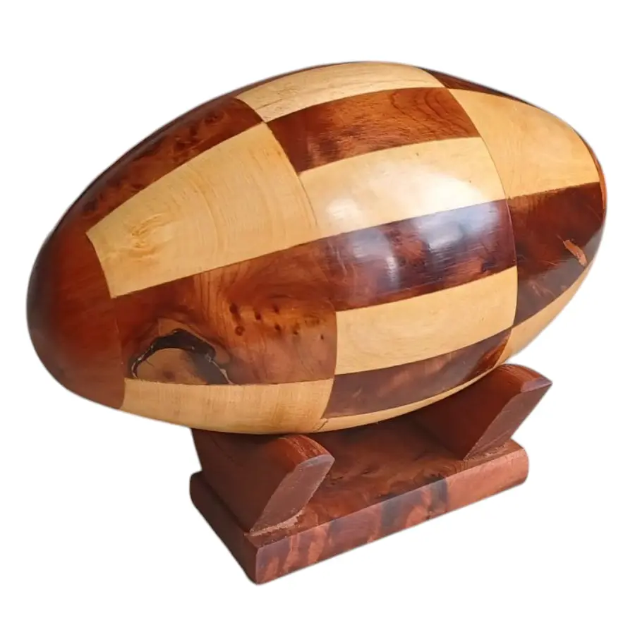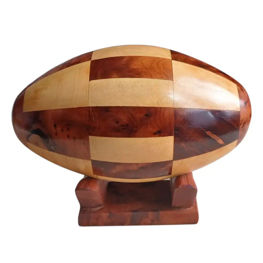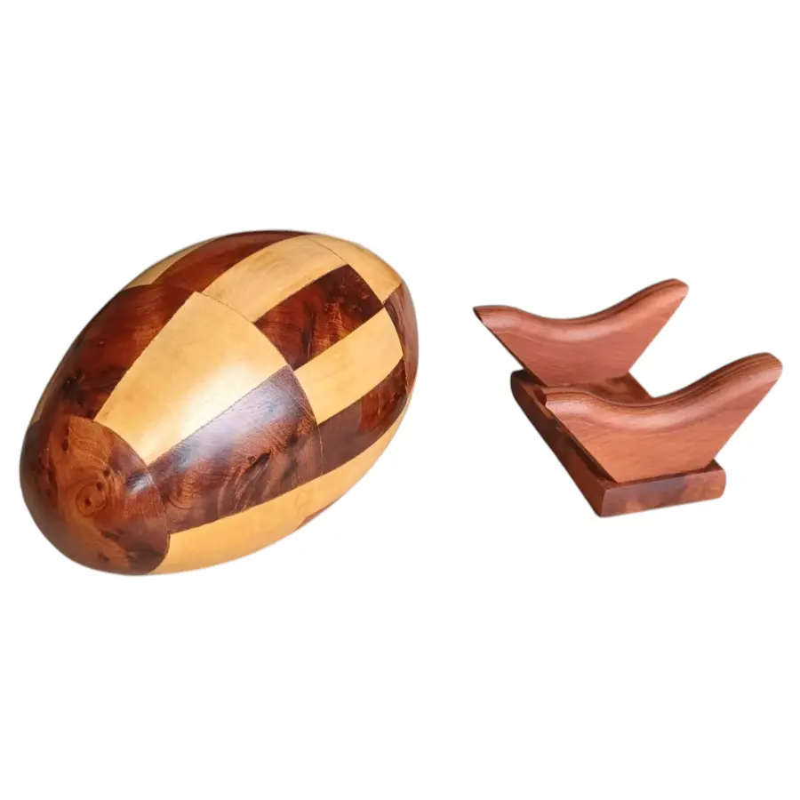 Ballon de rugby en Loupe de Thuya sculpté à la main, sur support en bois distinct. Élégant et original, il ajoute une touche unique à votre intérieur.