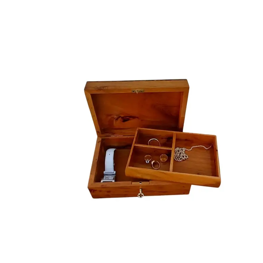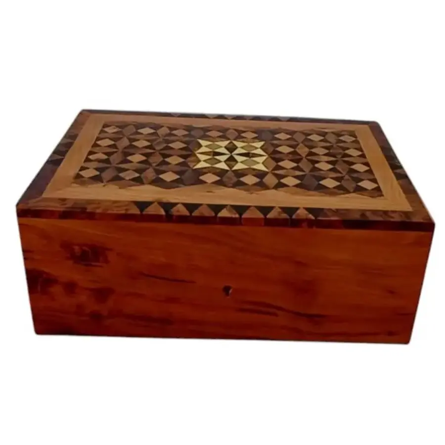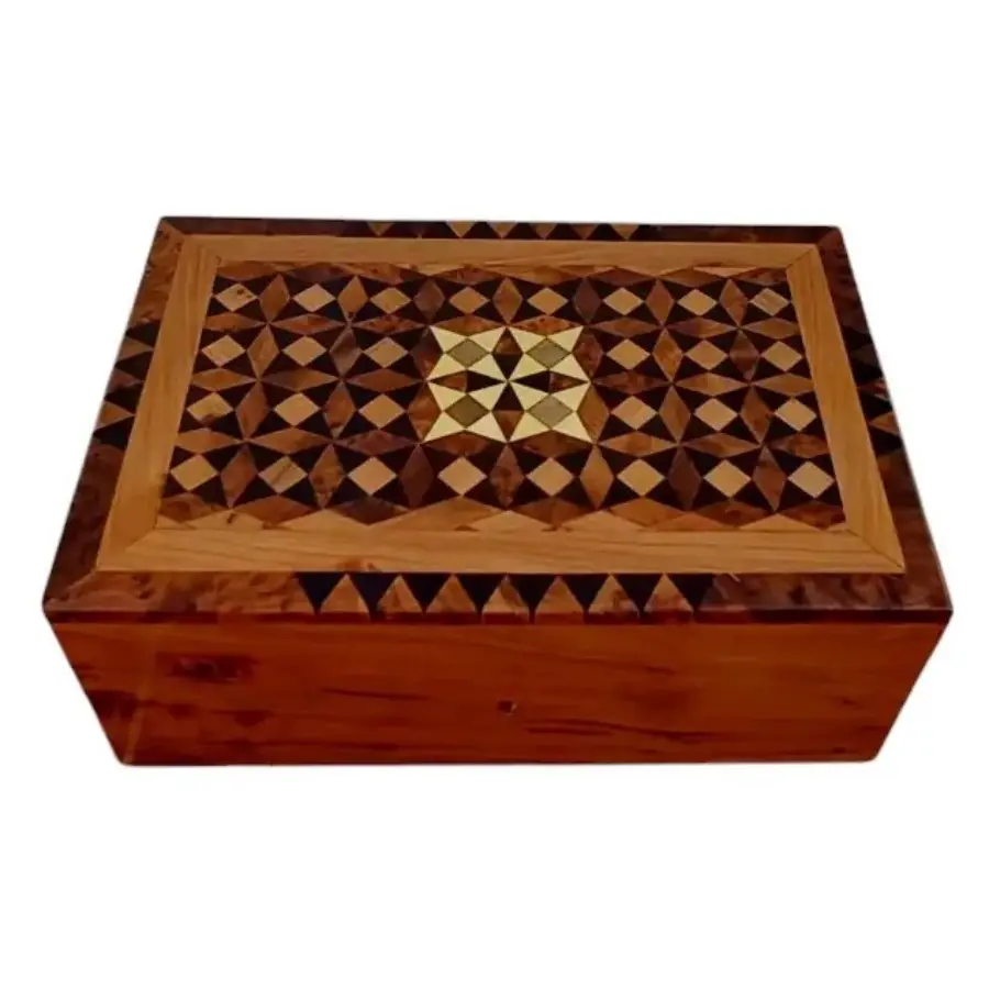 Boîte à bijoux artisanale en loupe de thuya avec incrustations motifs origami. Deux niveaux de rangement, dont un plateau amovible. Élégante et parfumée.