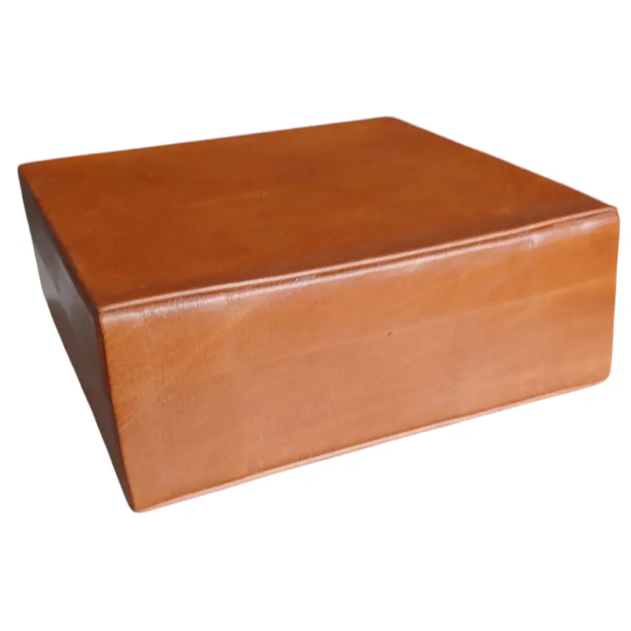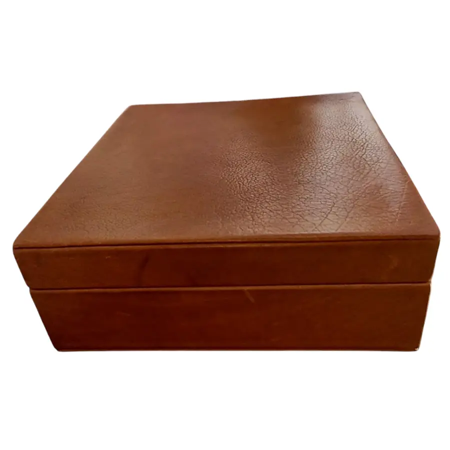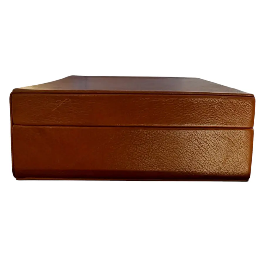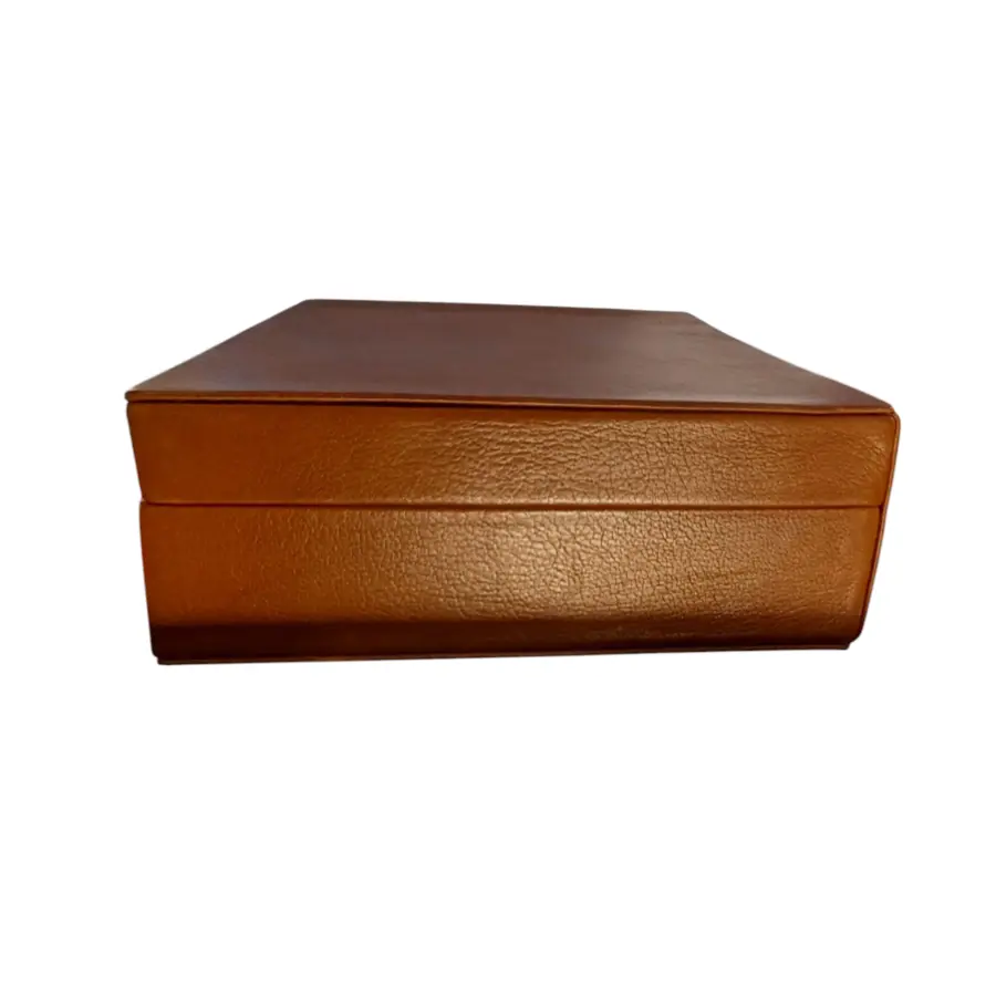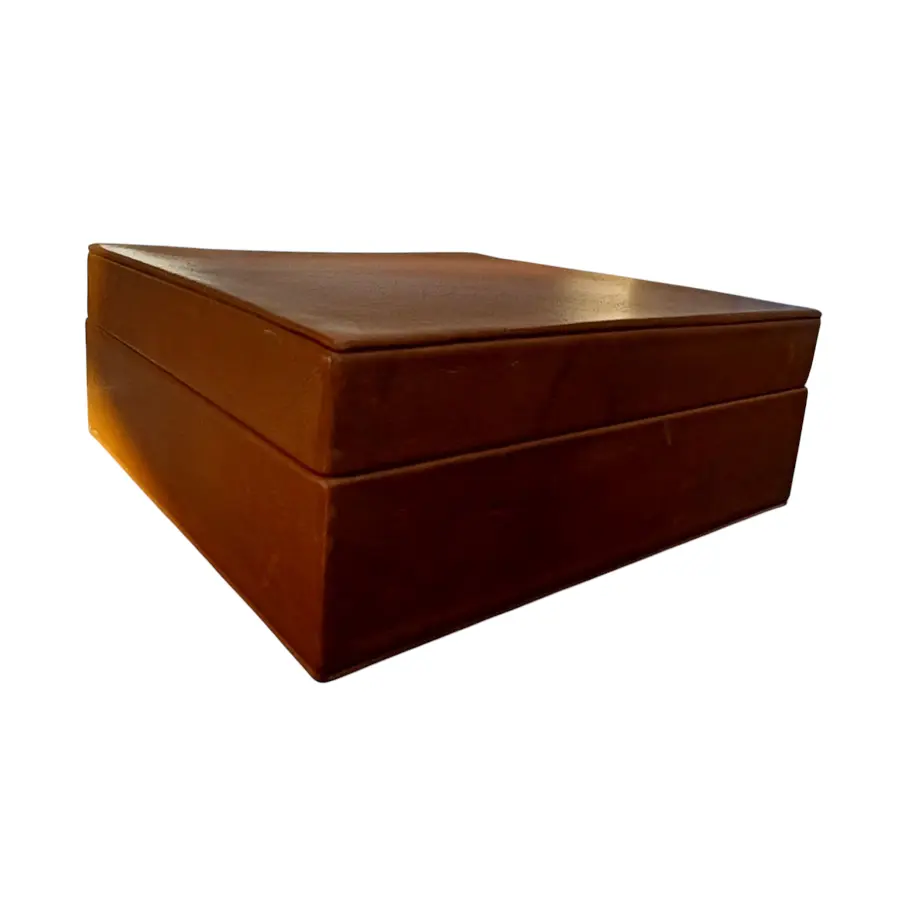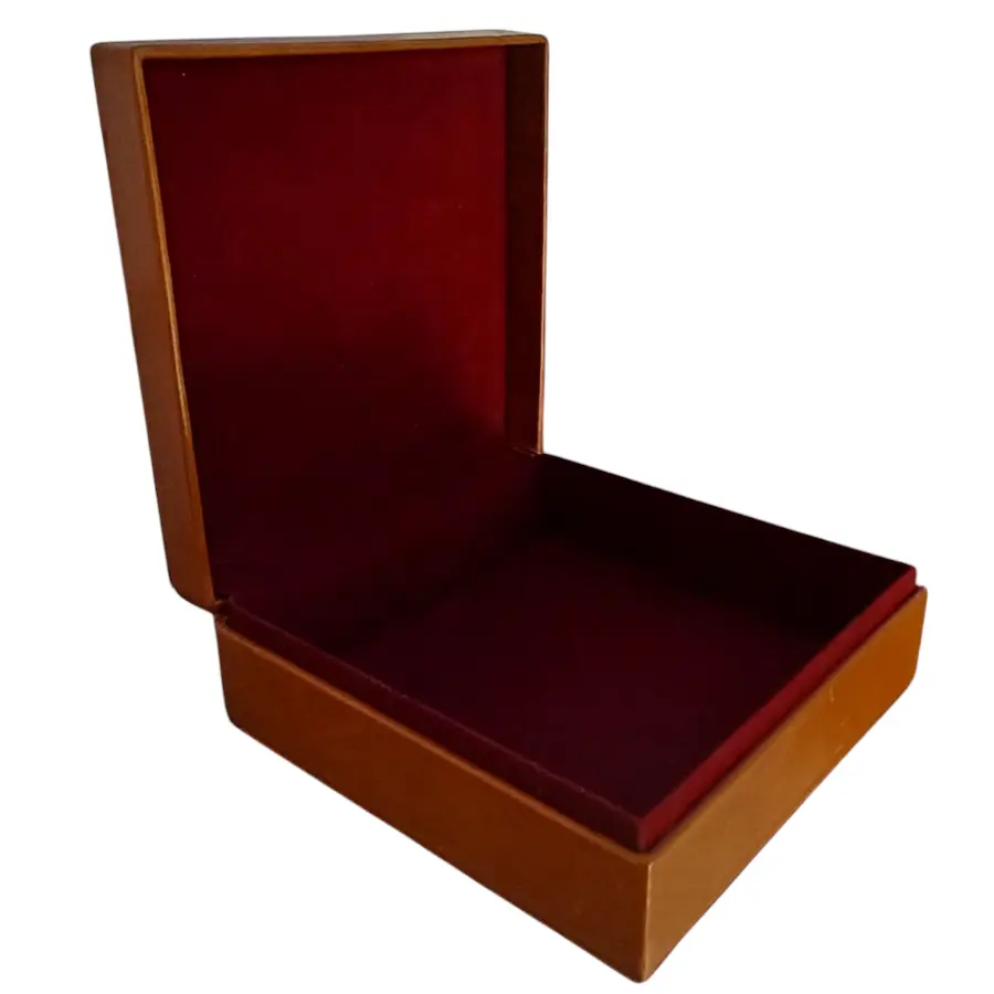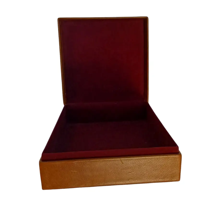 Boîte en cuir camel, confectionnée à la main avec un cuir souple et parfumé. Intérieur en daim bordeaux pour protéger vos trésors. Parfaite comme boîte à bijoux ou à souvenirs.