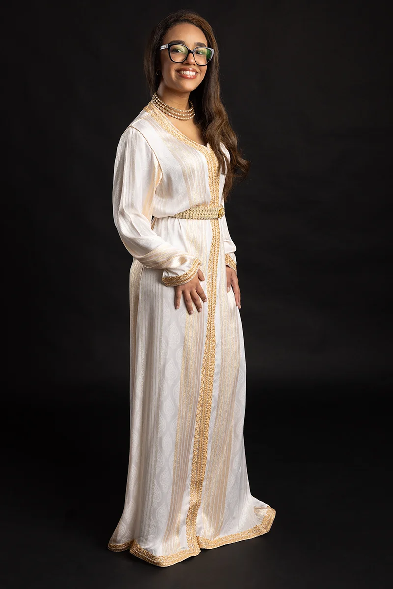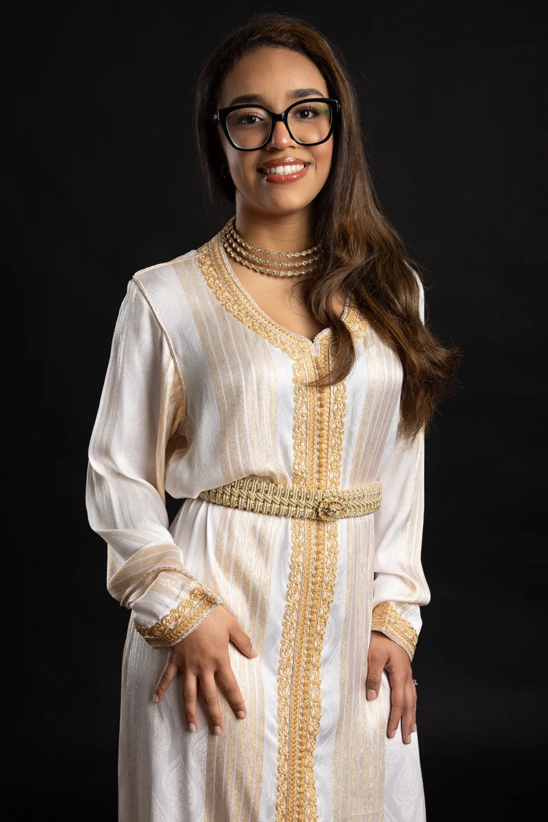 - Ornements : Broderies dorées délicates et boutons "aqad" artisanaux