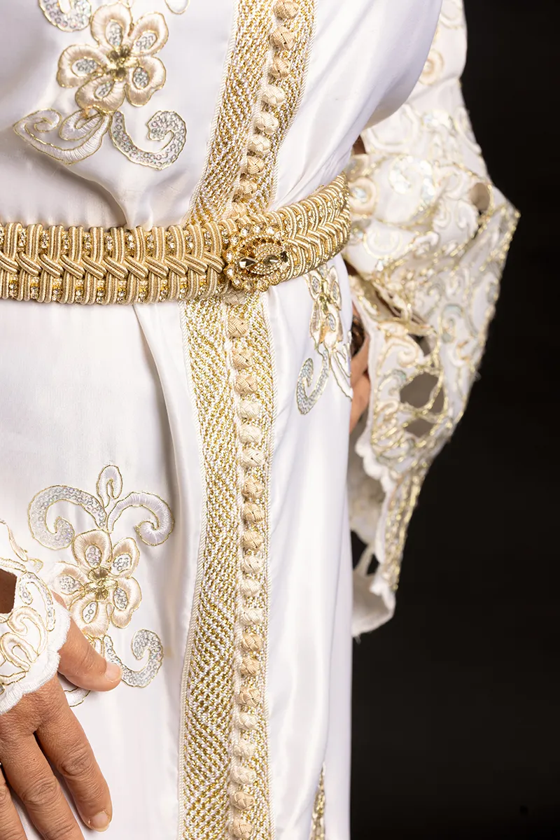 Caractéristiques du Caftan Blanc en Satin et Broderie Or :