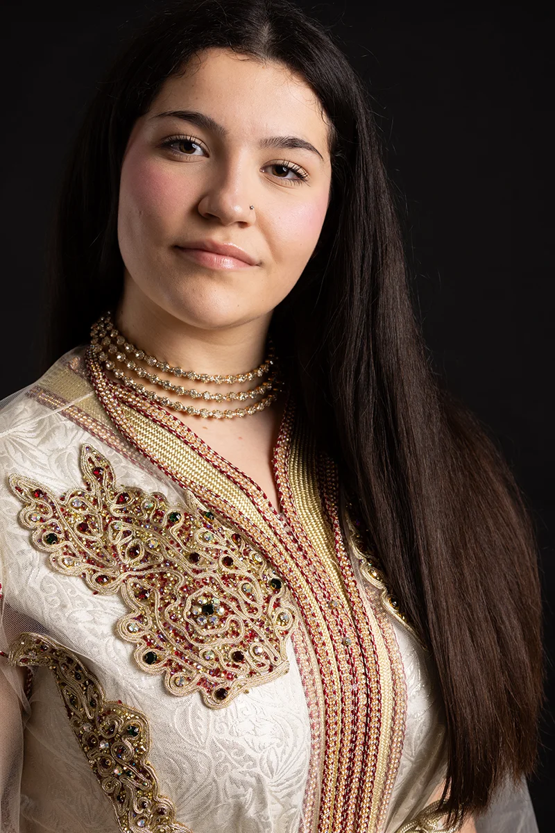 - Design : Manches longues en voile léger, broderies traditionnelles dorées et perles fines