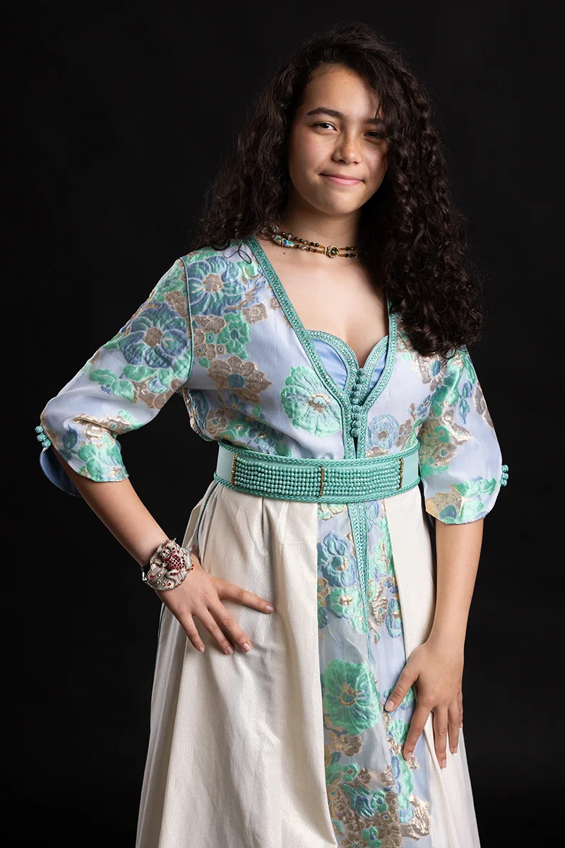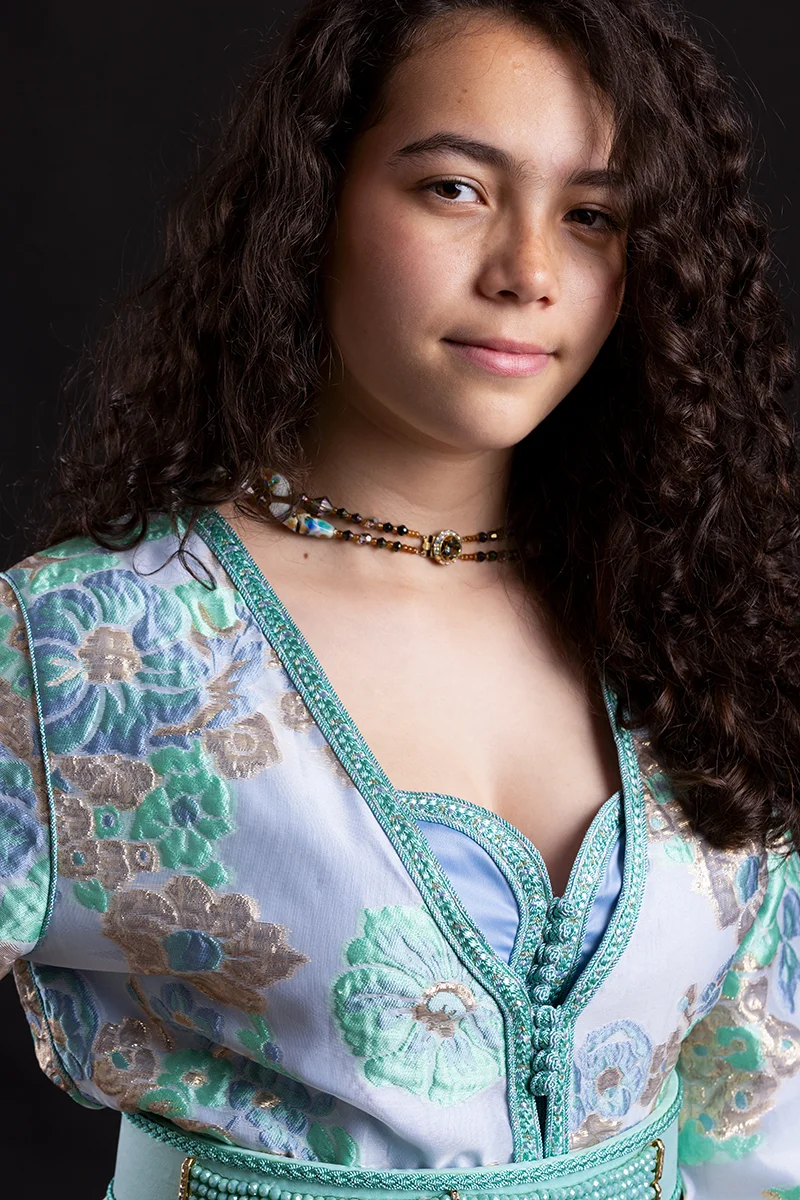 Ce caftan d’exception se distingue par son mariage de matières nobles : le brocart et le satin. La sfifa bleue, travaillée avec finesse, souligne les lignes du vêtement, tandis que la ceinture assortie affine la silhouette.