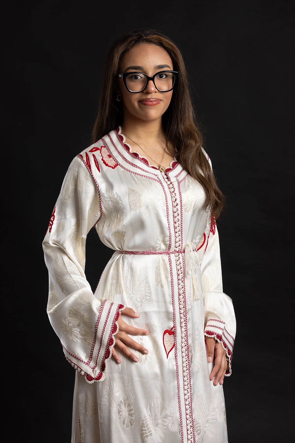 - Ornements : Broderie rouge élégante et boutons traditionnels aqad