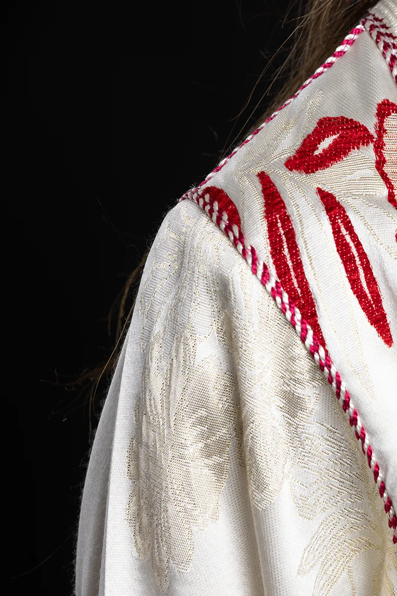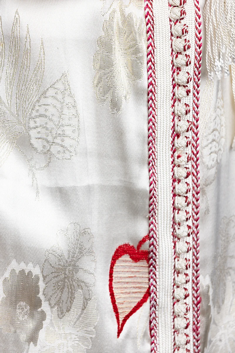 Ce caftan en brochet de soie beige est sublimé par une délicate broderie rouge. Les boutons ‘aqad’, judicieusement placés au centre et sur la ligne de manche intérieure, apportent une touche d’élégance intemporelle. Ceinture non-fourni.