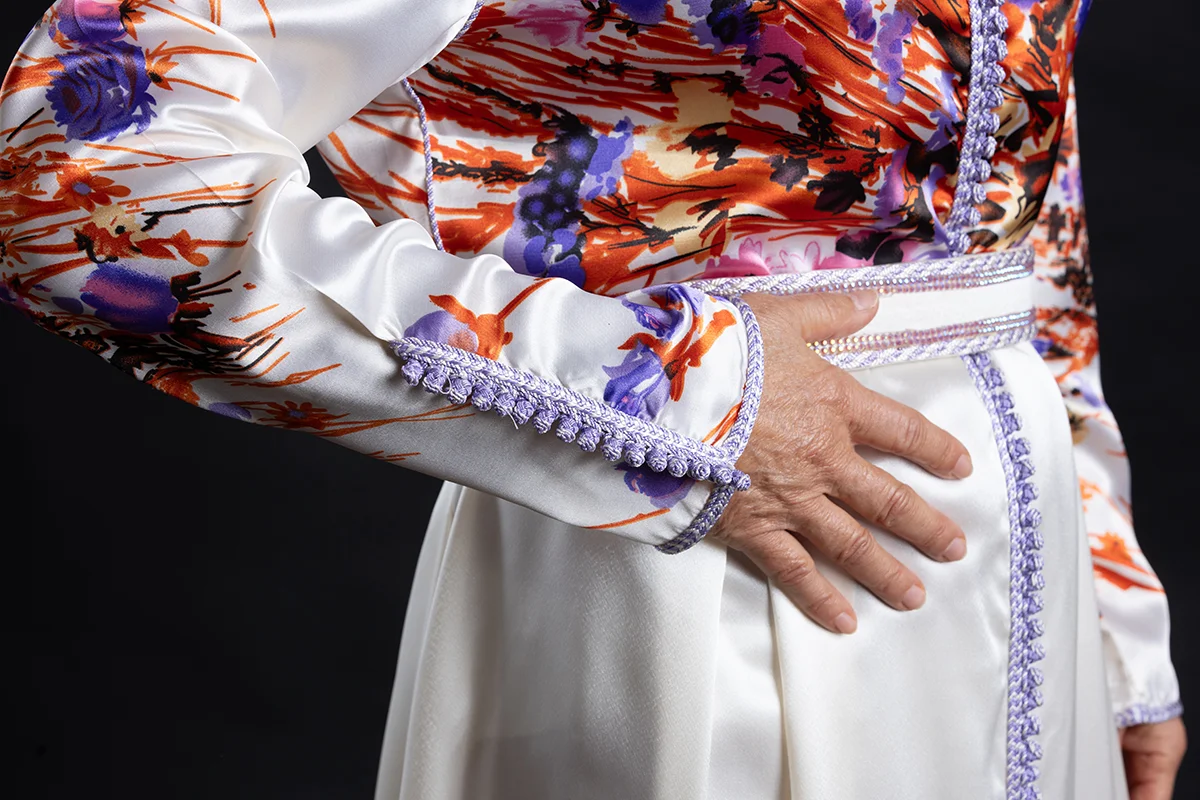 Ce caftan en satin de soie est une ode à l’élégance. Le buste, paré d’un imprimé aquarelle délicat, contraste avec la fluidité d’une jupe blanche immaculée. Un vêtement intemporel, parfait pour toutes les occasions. Vendu avec ceinture.