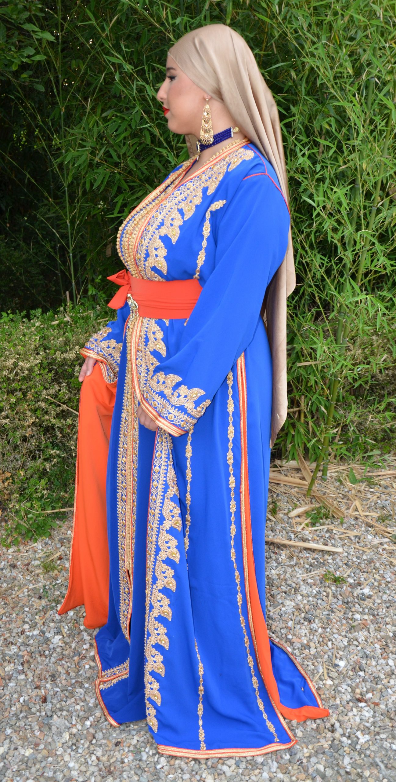Laissez-vous séduire par l’élégance de ce caftan deux pièces d’un bleu océan profond, sublimé par de fines broderies au fil doré. Une création majestueuse aux accents royaux, où chaque motif capte la lumière avec raffinement.