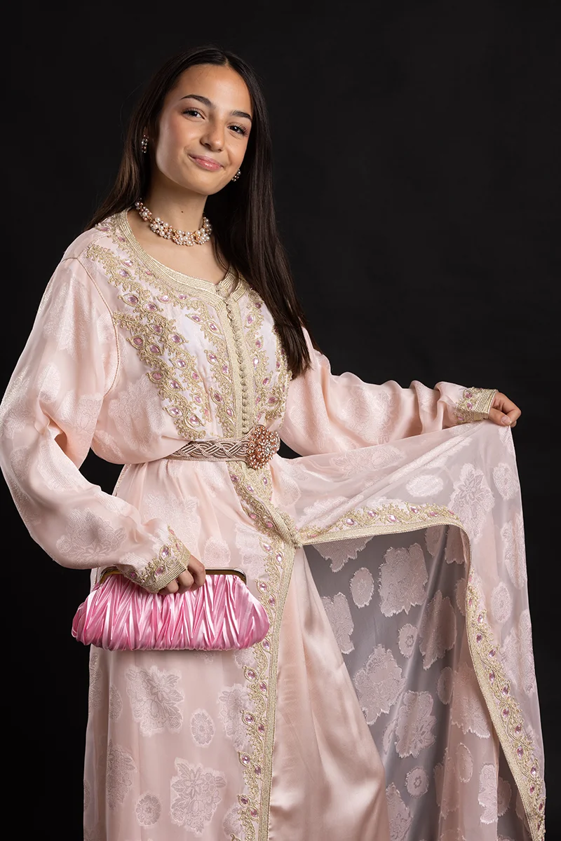 Caftan deux pièces en satin de soie rose pâle, sublimée par un dessus en voile brodé de fil d'or et de perles roses, évoque la douceur et l'éclat. Ceinture non-fourni.