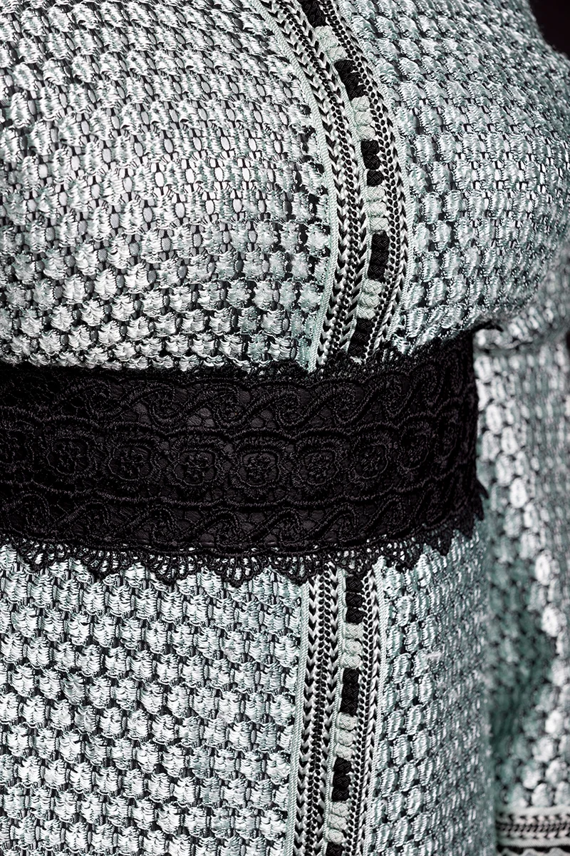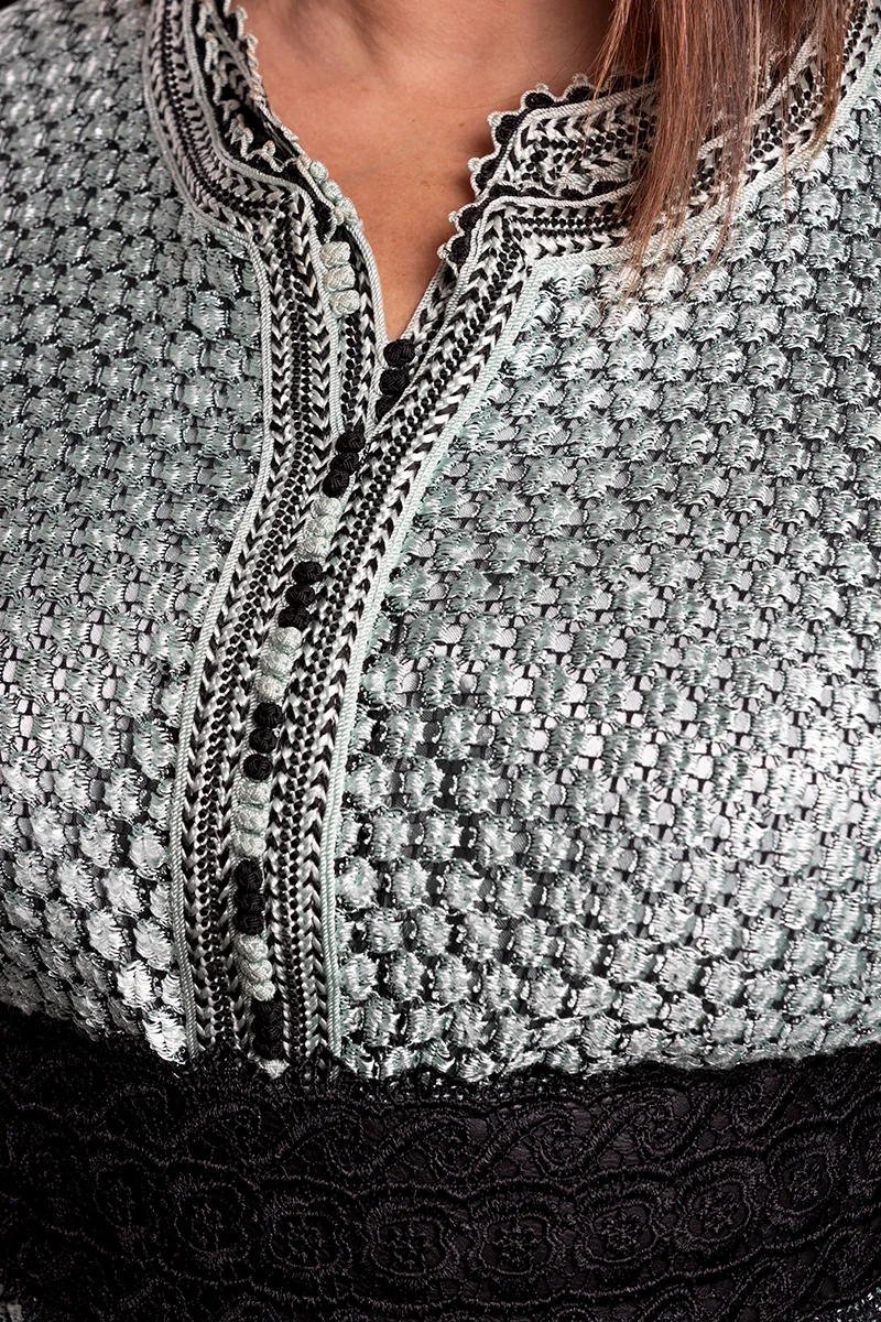Caftan Vert et Noir : Ce magnifique caftan deux pièces, confectionné dans un satin de soie vert, est rehaussé d’un dessus en matière tissée noire et verte, apportant une touche d’originalité. Il est vendu avec sa ceinture assortie.