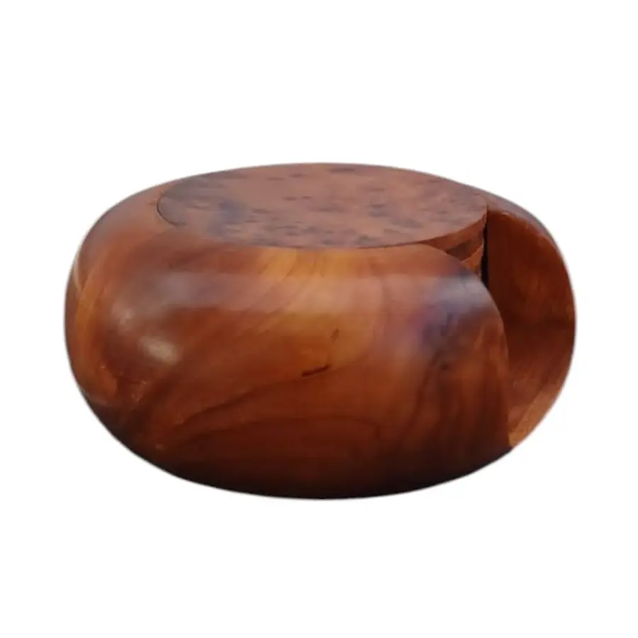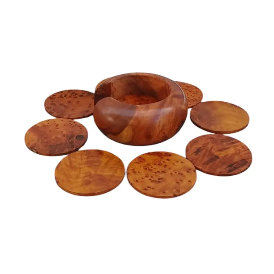 Ensemble de 12 sous-verres en loupe de thuya, accompagnés d’un présentoir sculpté à la main. Bois parfumé pour une touche d’élégance naturelle.