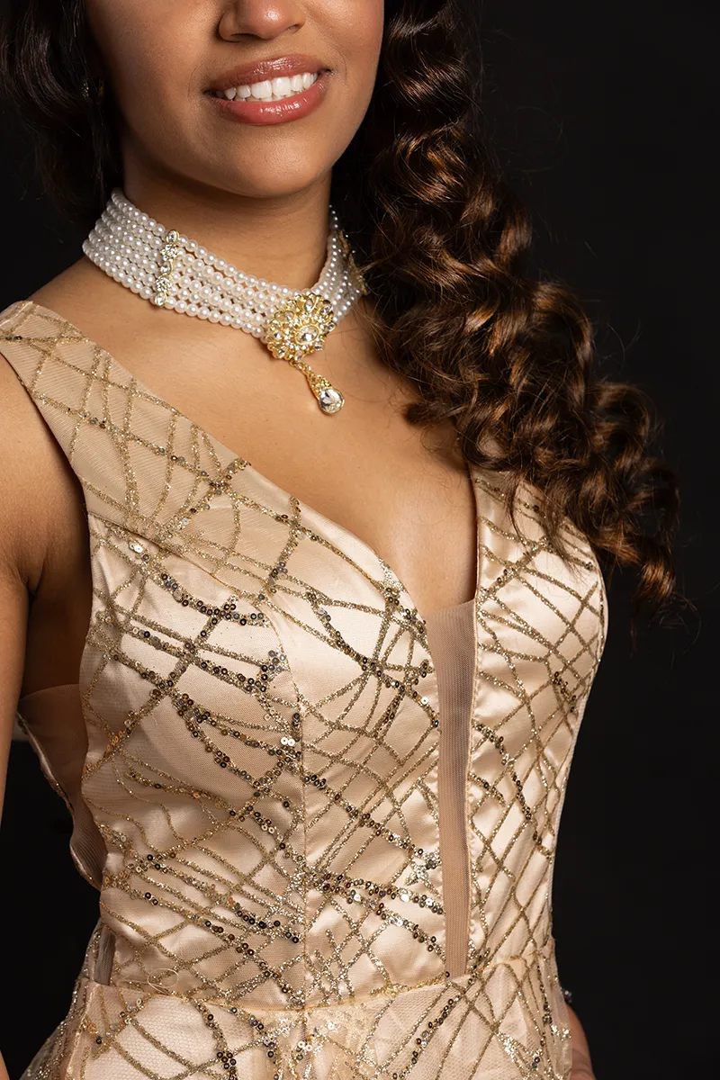 Affirmez votre style avec cette robe longue ornée de paillettes dorées, parfaite pour les grandes occasions, soirées et cérémonies. Son design raffiné met en valeur la silhouette avec une touche de glamour et de sophistication.